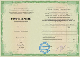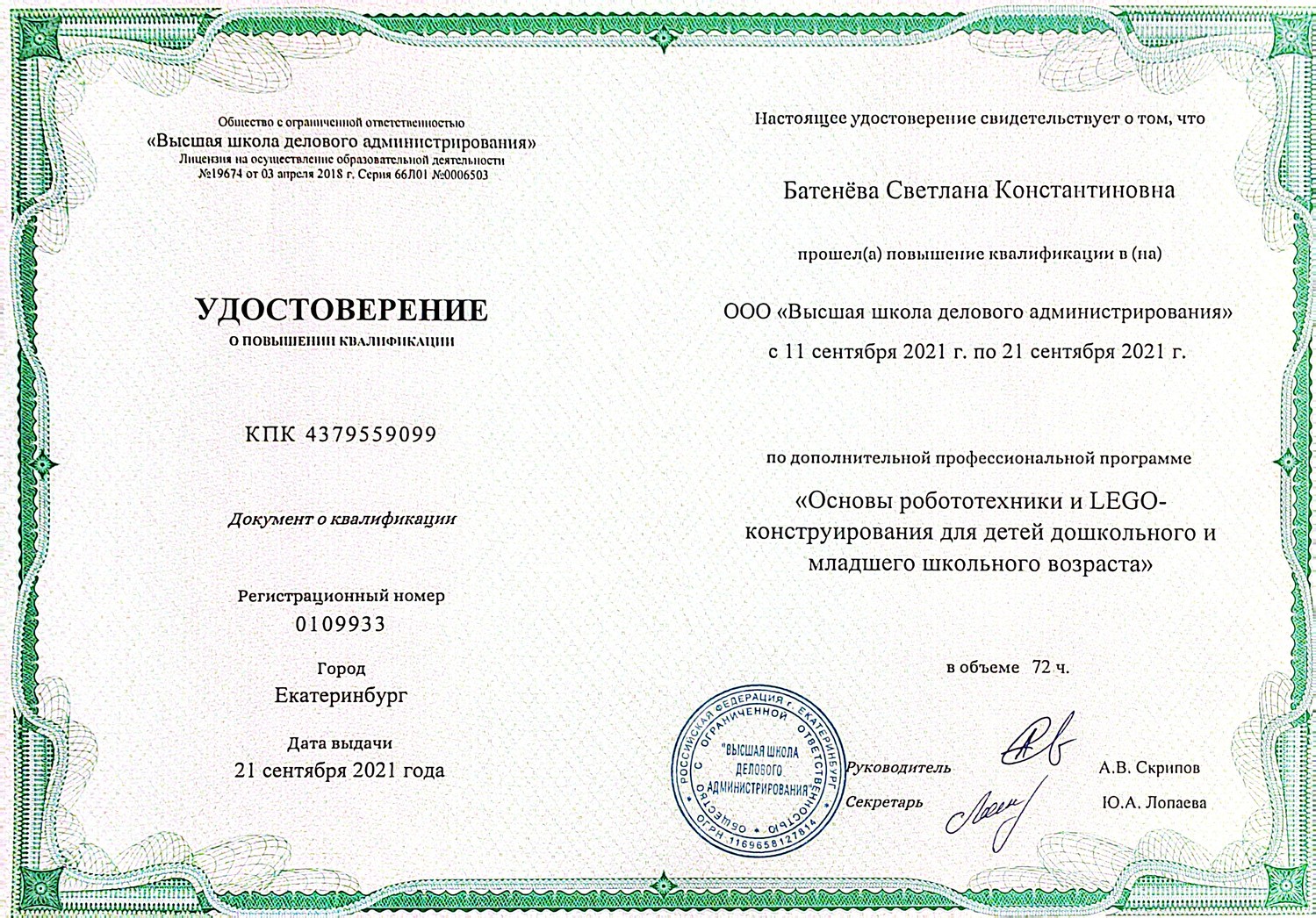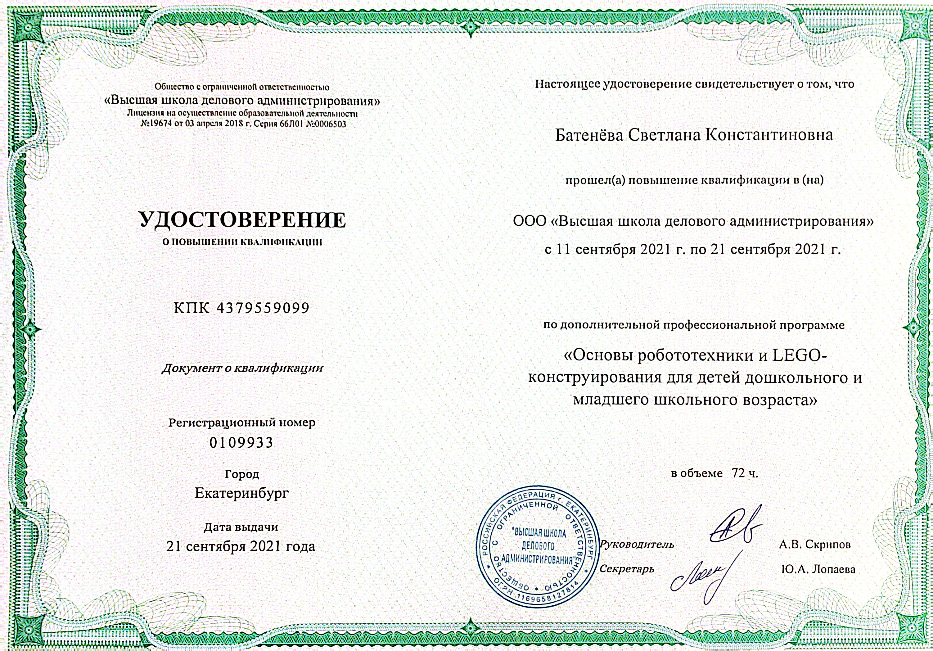 "Основы робототехники и LEGO - конструирования для детей дошкольного и младшего школьного возраста", 72 часа, удостоверение № 0109933 21.09.2021 г.