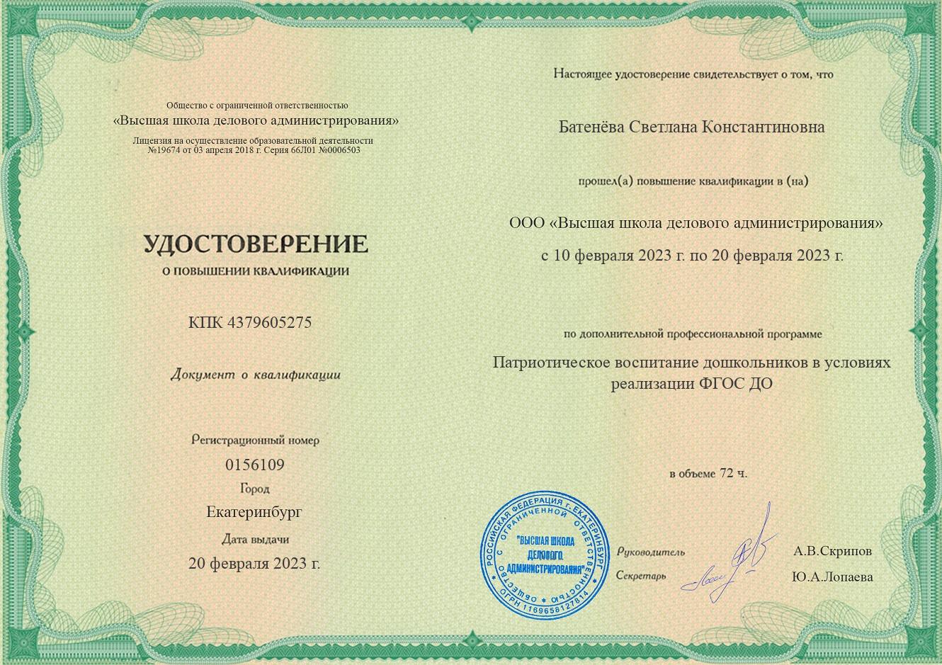 "Патриотическое воспитание дошкольников в условиях реализации ФГОС ДО", 72 часа, удостоверение № 0156109 20.02.2023 г.