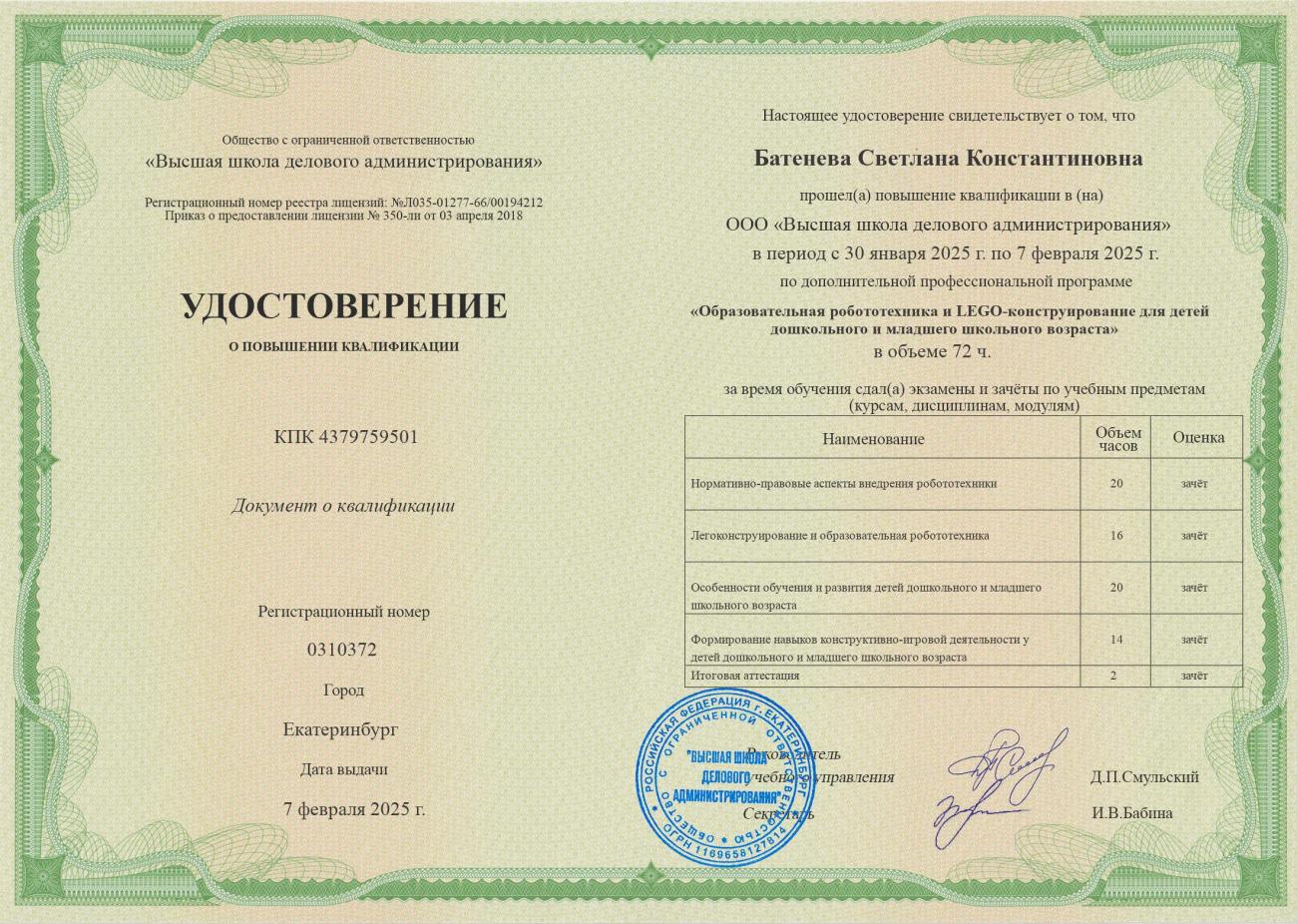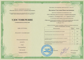 "Образовательная робототехника и LEGO - конструирования для детей дошкольного и младшего школьного возраста", 72 часа, удостоверение № 0310372 07.02.2025 г.