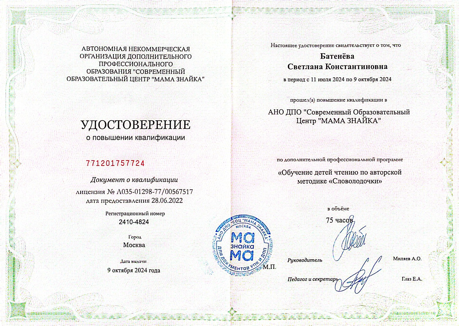 "Обучение детей чтению по авторской методике "Словолодочки", 75 часов, удостоверение № 2410-4824 09.10.2024 г.