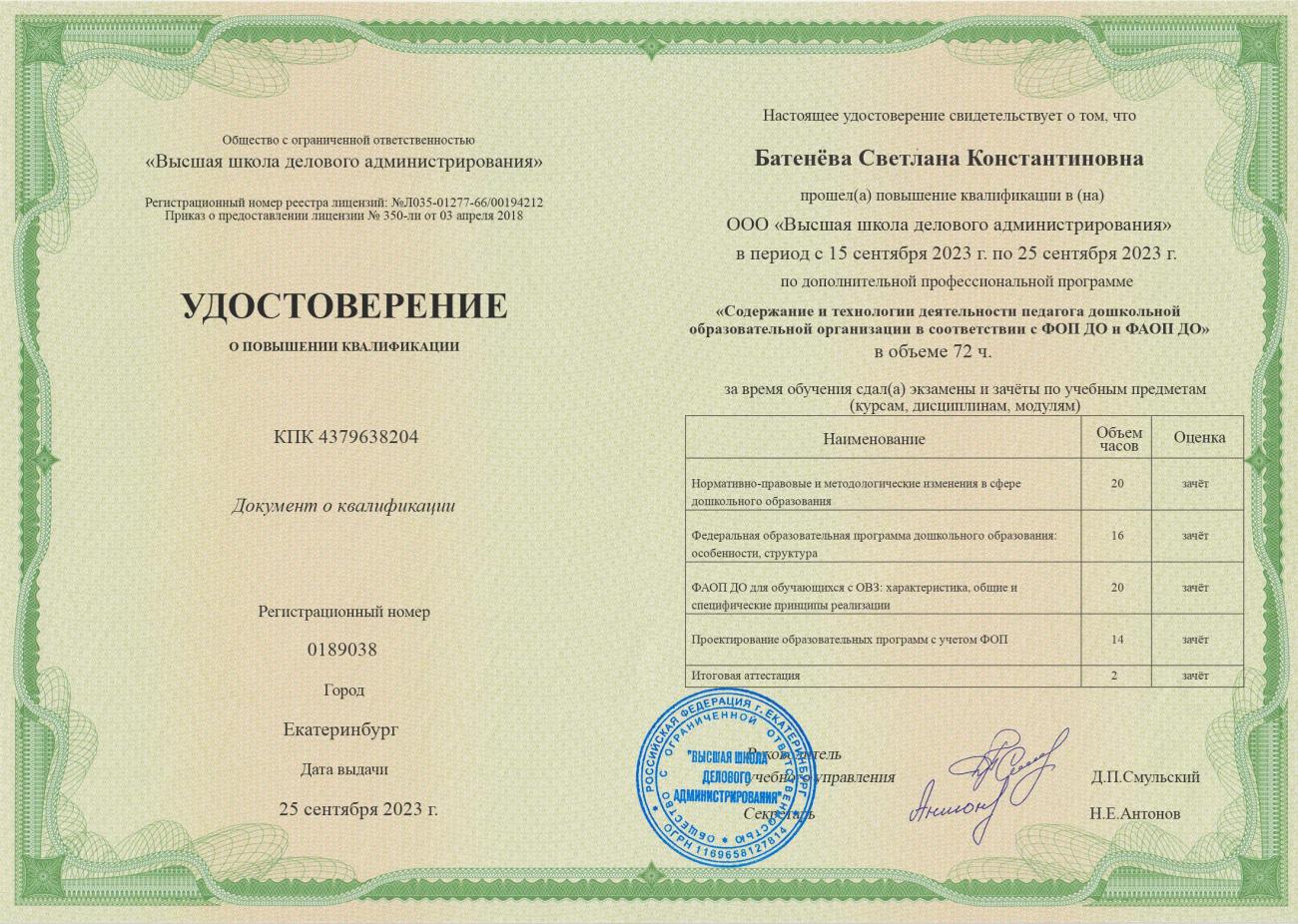 "Содержание и технологии деятельности педагога дошкольной образовательной организации в соответствии с ФОП ДО и ФАОП ДО", 72 часа, удостоверение № 0189038 25.09.2023 г.