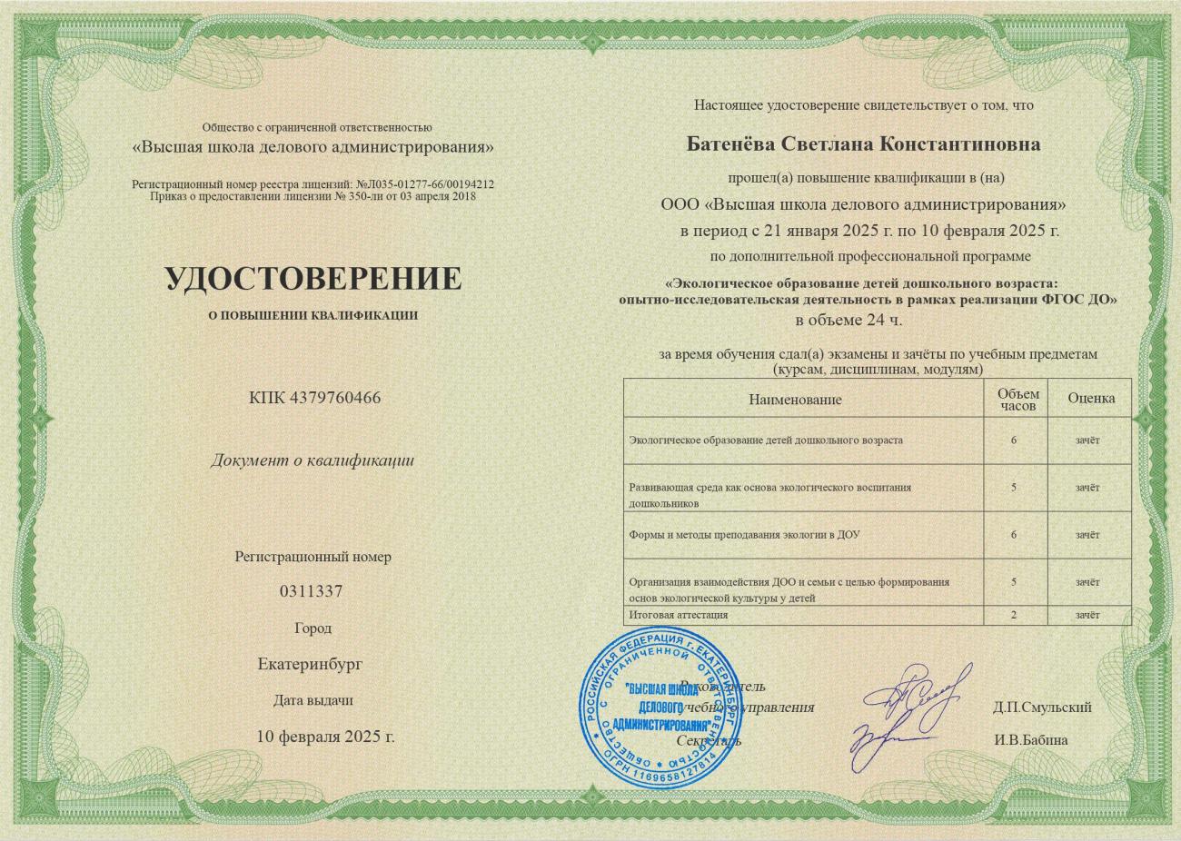 "Экологическое образование детей дошкольного возраста: опытно-исследовательская деятельность в рамках реализации ФГОС ДО", 72 часа, удостоверение №