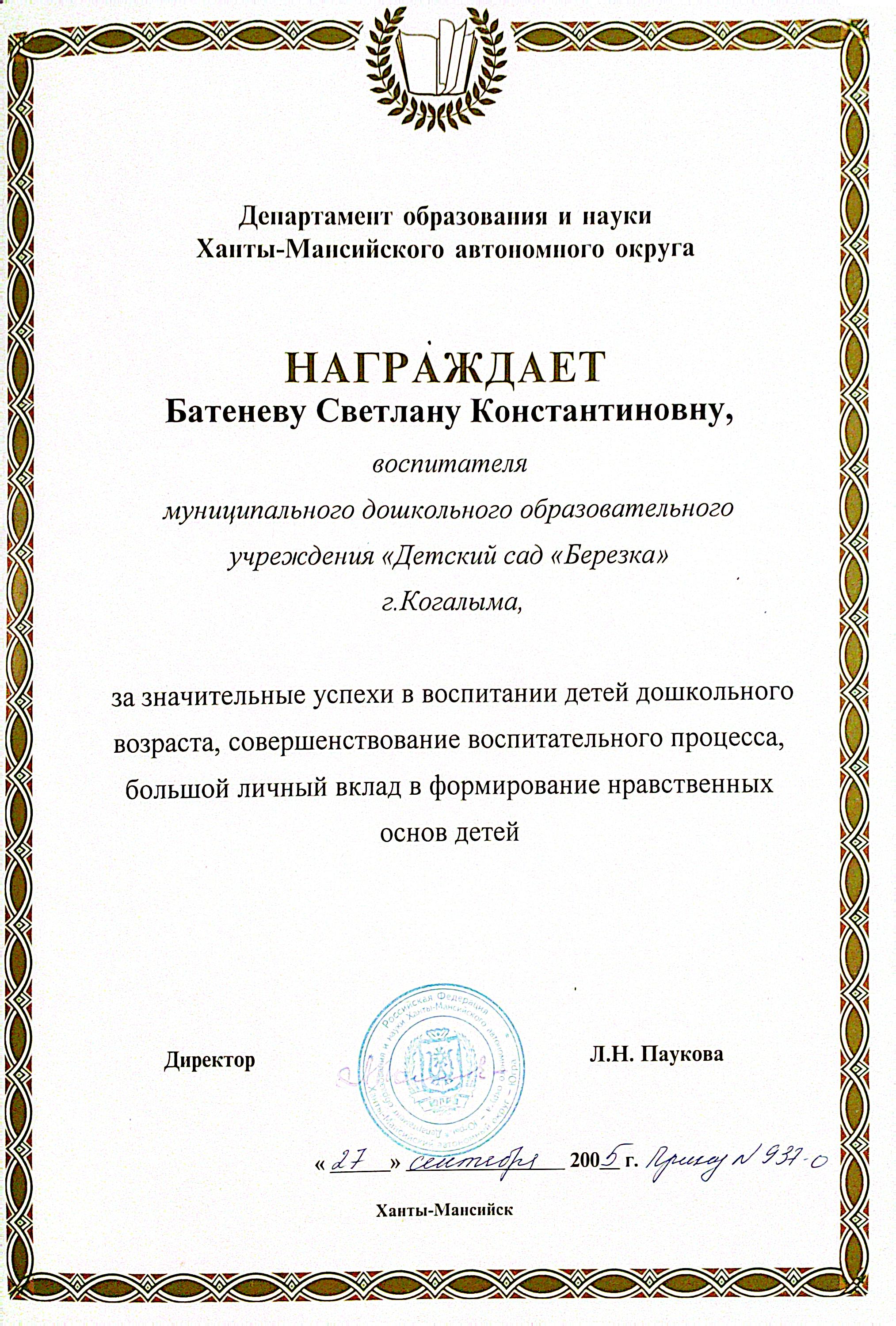 2005 г. Почётная грамота Департамента образования и науки Ханты - Мансийского автономного округа - Югры