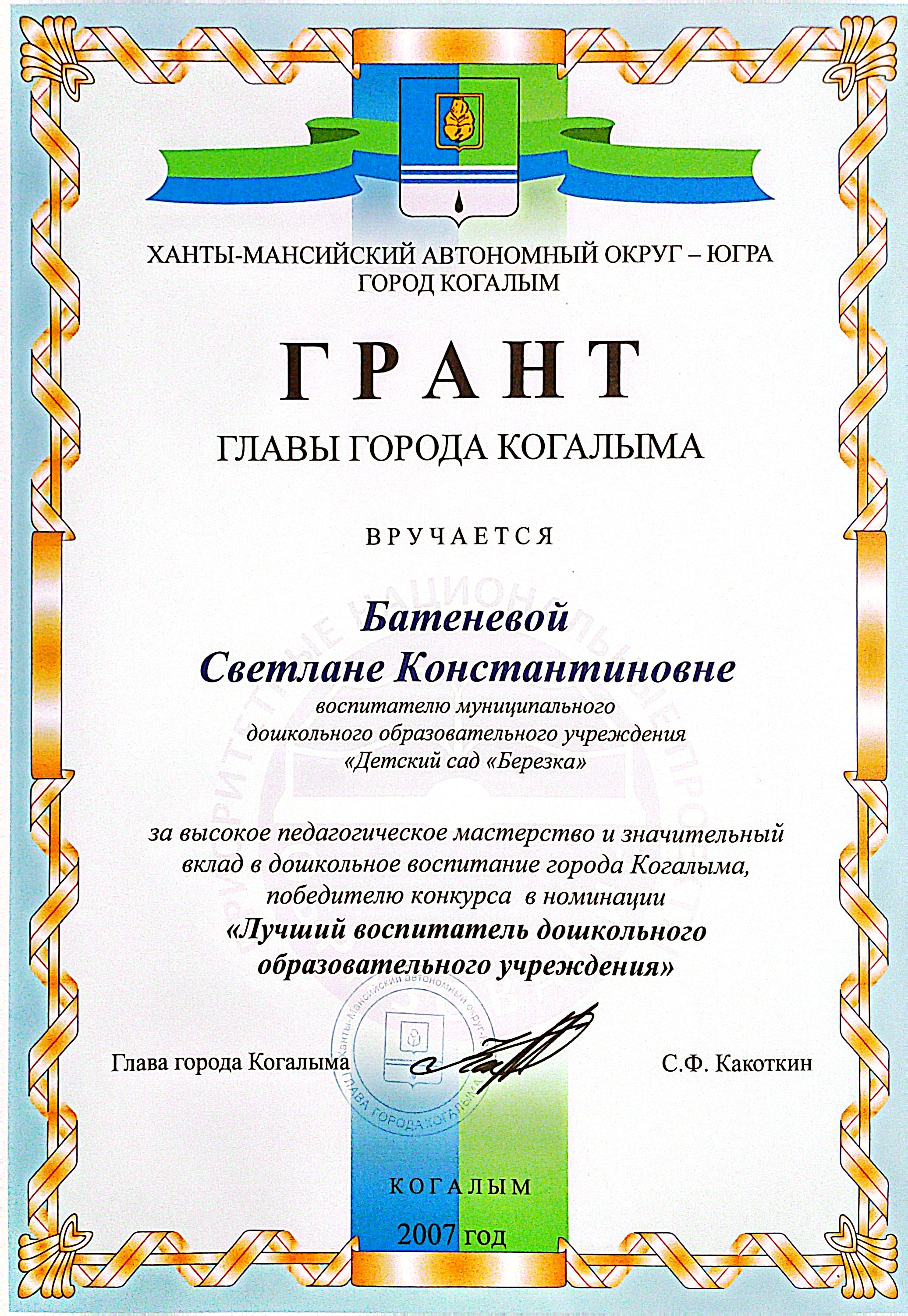 2007 г. Грант главы города Когалыма "Лучший воспитатель дошкольного образовательного учреждения"