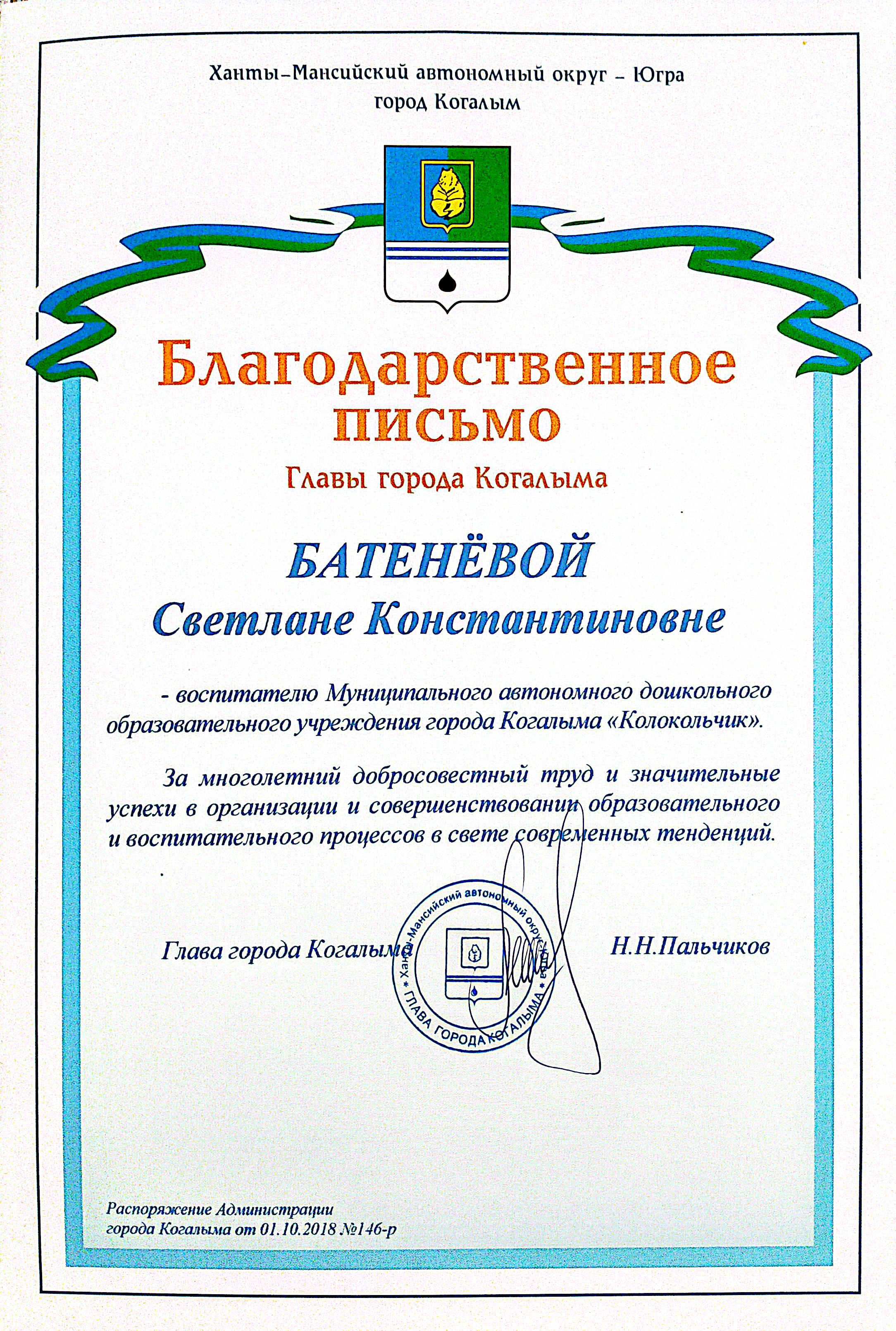 2018 г. Благодарственное письмо главы города Когалыма