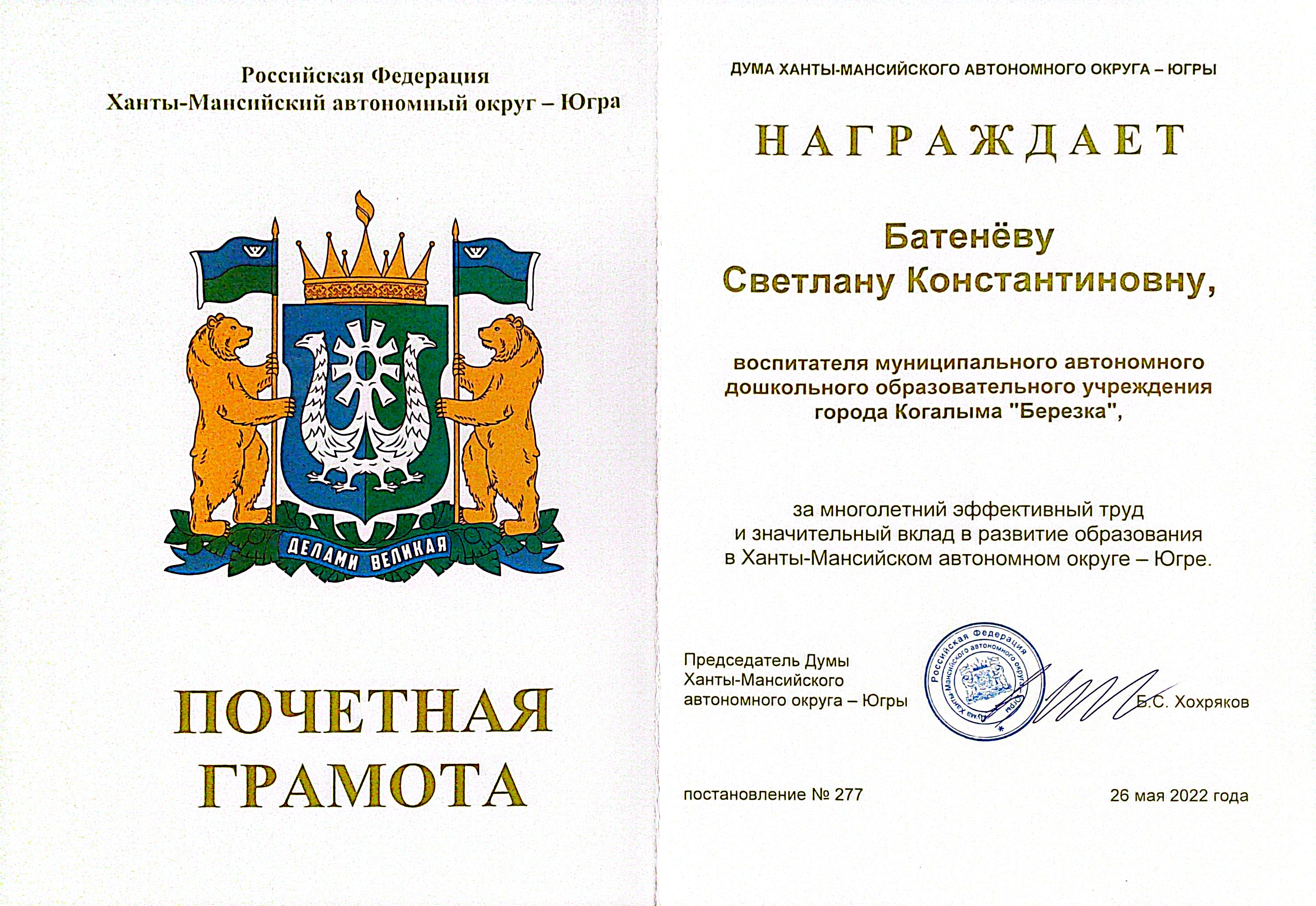 2022 г. Нагрудный знак и Почётная грамота Думы Ханты - Мансийского автономного округа - Югры