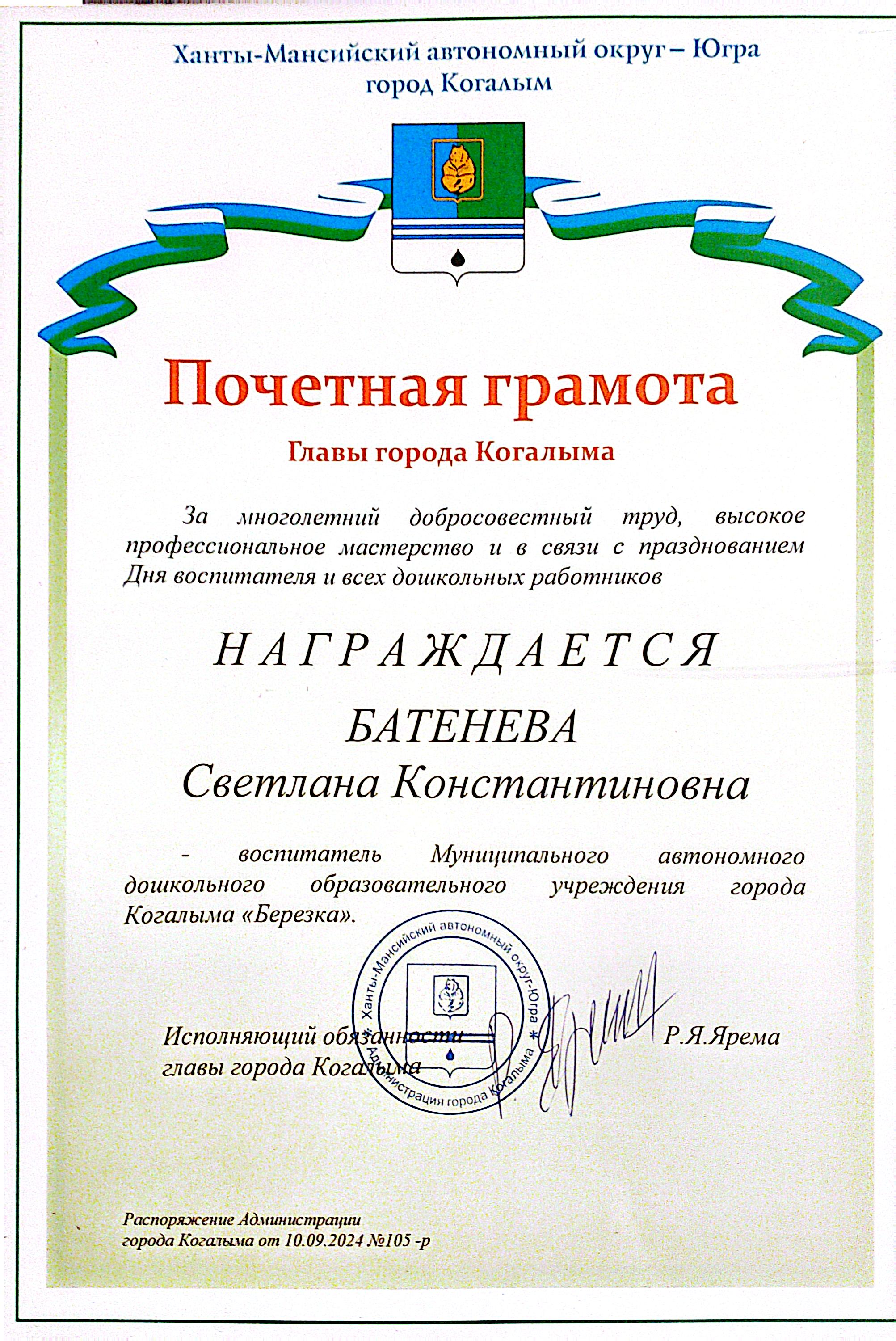 2024 г. Почётная грамота главы города Когалыма
