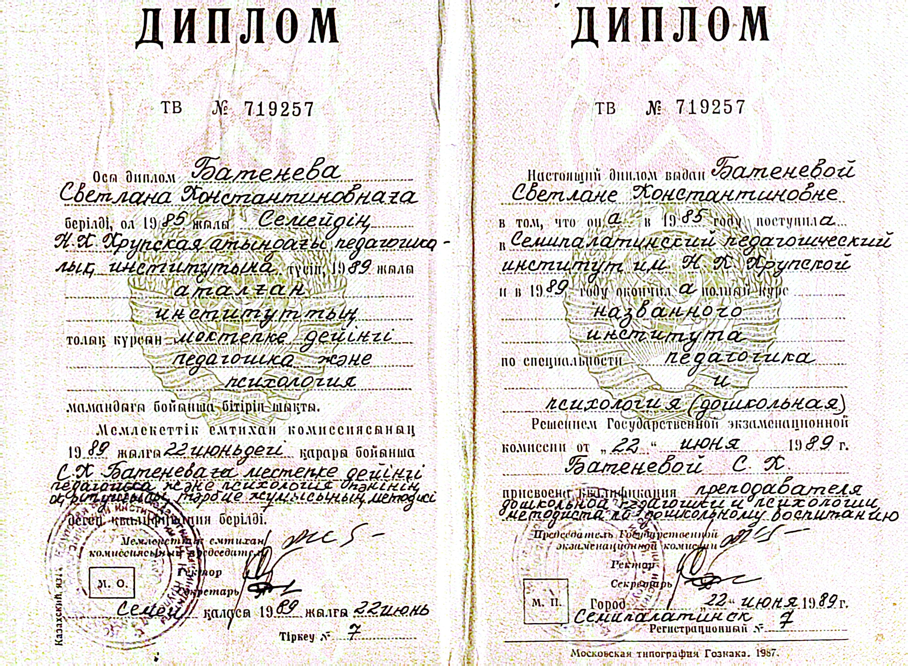 Образование: высшее (Семипалатинский педагогический институт имени Н.К.Крупской) год окончания 1989 г. (Диплом)